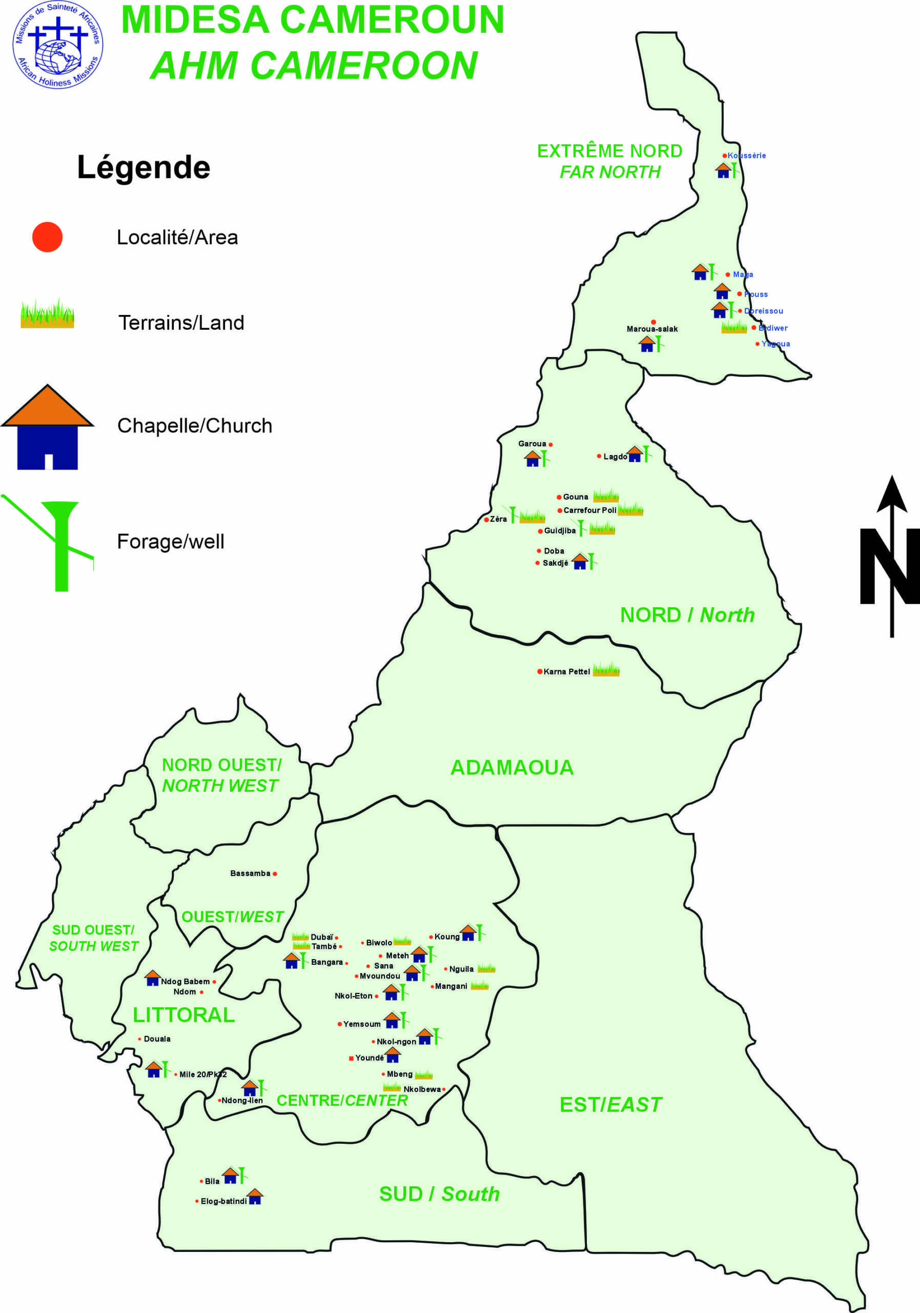 This map of Cameroon is meant to display the work that AHM has done by the grace of God. On it, you can see how many churches have been planted and built, the wells that have been installed, land purchased that is awaiting church construction and so forth. Please continue to pray for our national overseer, Rev. Franklin Yebga and the family of AHM churches in Cameroon.